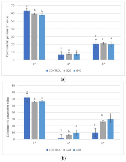 where a*g, L*g, and b*g are the colour parameters referring to G20 and G40 samples; a*c referred to the control sample. The colour parameters enabled the calculation of the browning index, as follows: