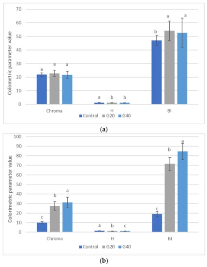 The overall change in colour, ΔE*ab, between the control and samples G20 and G40 was calculated according to Mikulec et al. [] following Equation (3):