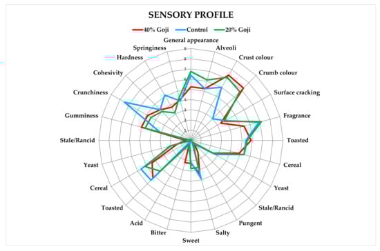 The sensory profiles for the control and modified breads are shown in Figure 4. The presence of crust and crumb colouring were found as the main appearance descriptors while fragrance-flavour was the main olfactory descriptor. Moreover, the principal taste descriptors were toasted and cereal. All textural descriptors were recognised by panellists, with particular emphasis on crunchiness. The enriched breads with both 20% and 40% goji fresh flesh puree differentiated from the control bread with significantly higher appearance descriptors. Taste and flavour descriptors did not show significant differences among samples (p < 0.01).