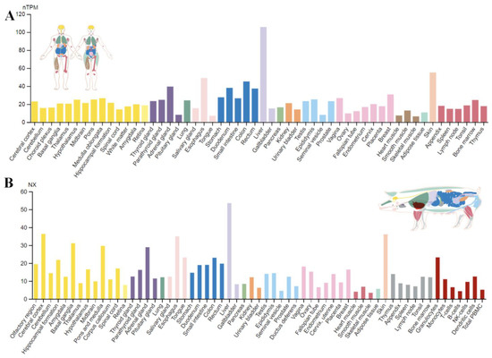 HMGCR expression profile in human (A) and pig (B) tissues. Data credit: The Human Protein Atlas [60,61] and The Pig RNA Atlas [61,62]. Data summary images were obtained from v22.proteinatlas.org via https://www.proteinatlas.org/ENSG00000113161-HMGCR/tissue (human protein expression profile, accessed on 10 January 2023) and https://www.rnaatlas.org/ENSSSCG00000014080-HMGCR (pig protein expression profile, accessed on 10 January 2023).