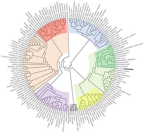 Phylogenetic analysis of 3-hydroxy-3-methylglutaryl coenzyme A (HMG-CoA) reductase (HMGCR) originated from amino acid differences in animal protein sequences. The circular tree was created by downloading amino acid sequences from NCBI using BLASTp search, while the distance of each entry was calculated using CLC software. In the figure, a division can be observed between carnivores (blue), whales and dolphins (dark green), even-numbered ungulates (light green), bats (yellow), odd-numbered ungulates (gray), primates (purple), rodents (orange) and marsupials, planktonic and oviparous (red).