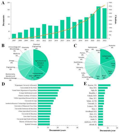 Bibliometric results related to the use of plant waste for swine feeding. (A) shows the number of scientific articles published between 2007 and 2022; (B) shows the top 10 scientific areas; (C) shows the top 15 countries with the most articles; (D) shows the top 15 affiliations with the most articles; and Panel (E) shows the authors with the most publications.