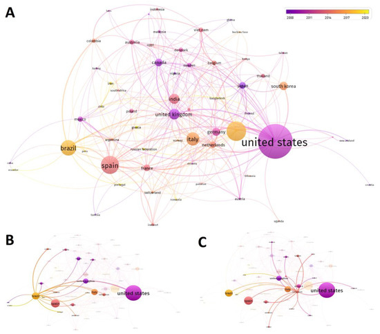 Co-authorship map showing the existing networks between countries involved in the publication of scientific articles related to the inclusion of agro-food waste in pig diets. (A) shows the global network of countries. (B) focuses on Brazil, and (C) focuses on the Netherlands. The size of the nodes indicates their frequency. The curves between the nodes represent co-occurrence in the same publication.
