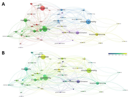 Co-occurrence map showing the existing networking of terms reported as keywords in publications related to the inclusion of agri-food waste in swine diets. (A) shows clustering in five different groups. (B) shows the same network from a temporal perspective. The size of the nodes indicates their frequency. The curves between nodes represent their co-occurrence in the same publication.