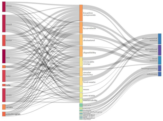 Ten main countries publishing articles on the topic of sustainable reuse of agri-food waste can be identified (Figure 6). Most of the countries were in accordance with data shown in Figure 3, Figure 4 and Figure 5. However, unlike previous analyses, in Figure 6, each country was also associated with the main keywords listed in the second branch. These connections provide useful information on the main research lines toward which each country is currently focusing its research. In particular, the USA and Brazil are the most active countries, but meanwhile, the USA seems to be indiscriminately interested in almost all topics, while Brazil is mostly focused on circular economy and sustainability topics. In contrast, it seems that other countries, such as China and Korea, focus more on reusing agro-food waste simply because it is rich in bioactive compounds rather than worrying about its disposal. Finally, Italy found several connections with the sectors listed in the third branch as “Food Science” and “Veterinary Science”, suggesting an interest in the reuse of food waste without harming the health status of humans and animals.