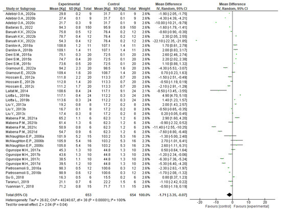 In order to test whether a diet enriched with plant waste could increase the growth performance of pigs, the search string used for the collection of articles in the previous section was supplemented with the following terms: TITLE/ABS (“growth performance” OR “production yield” OR “growth promoters”). The additional string allowed the reduction in the database to 125 entries, which were manually screened by reading the title, abstract, and/or full text. Specifically, original articles were eligible for meta-analysis if they met the following criteria: (i) English had to be the language used for writing the article; (ii) only entries from peer-reviewed journals were considered; and (iii) scientific experts were required to have evaluated the manuscript prior to publication. In addition, for this type of analysis, (iv) only randomized and controlled clinical trials involving pigs from farm system were considered; (v) the intervention was supposed to supplement pig diets with plant wastes; (vi) the number of subjects used in the clinical trial should be clearly reported, along with the measured experimental data (mean and standard deviation or standard error); (vii) the experimental parameter evaluated in the article should be growth performance; (viii) when experiments included the use of different concentrations of plant wastes for feed formulation, all diets were individually processed as stand-alone entries; and (ix) if articles reported experimentation using different plant wastes incorporated in separate feeds, these were considered as separate entries. Finally, (x) only articles in which the experimental intervention was compared to control groups fed a normal diet could be considered. As a result, of the 125 published full-text articles, 108 were excluded. Data (n = 39) from the selected articles (n = 17) [111,112,113,114,115,116,117,118,119,120,121,122,123,124,125,126,127] were used for meta-analysis by constructing the forest plot diagram. Because the data were accumulated from a series of independently performed studies, all selected studies were not functionally equivalent. Consequently, the forest plot originated was obtained using the random effect based on the calculated heterogeneity among the studies. The statistical heterogeneity between studies was tested using Cochrane's Q test (significance level p < 0.05) and the I2 statistic. In addition, a sensitivity analysis was performed to verify the influence of each study on the overall effect size, and the potential publication bias was examined by visual inspection of the respective funnel plots. The combined results of selected articles from the random-effects model suggested a negative effect on pig growth performance after the inclusion of plant waste as an ingredient in feeds (WMD: −1.71; 95% CI: −3.35; −0.07; I2 = 100%; p = < 0.00001) (Figure 7). Specifically, 15 trials reported a decrease in pig weight following the use of plant waste in the diet [112,116,118,119,120,122,123,124,126], while 9 suggested a positive effect [112,113,114,119,120,121,125,126,127], and the remaining 15 showed no statistically significant (p > 0.05) effects [111,113,115,116,117,118,119,120,126]. However, the latter result can be positively interpreted, because pigs that did not record a decrease in weight had continued to normally increase their weight without exhibiting toxic or side effects. At the same time, agro-waste was successfully removed from the environment, achieving a money-saving effect for its disposal [37].