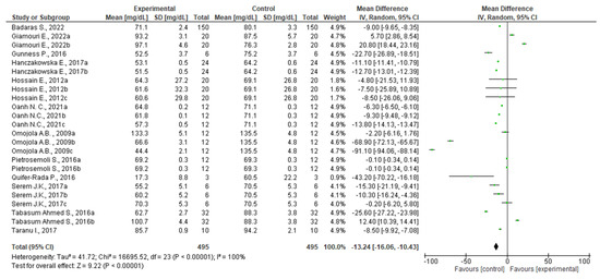 Forest diagram representation of cholesterol level of swine fed a diet inclusive of plant waste. Data were extracted from 17 articles [123,125,126,127,133,134,135,136,137,138,139,140] and plotted against the mean difference. Each horizontal line in the graph represents an individual study with the experimental mean value displayed as a green box. For each study, if the horizontal line (95% CI) crosses the vertical line, no significant differences can be observed between experimental and control groups. The black diamond at the bottom of the forest plot represents the average effect size calculated from the combination of the results from all selected studies.