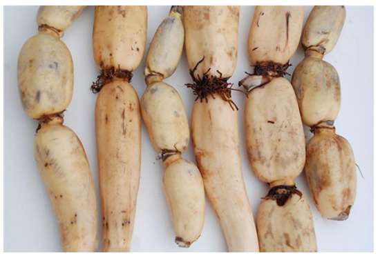 Fresh lotus roots (cultivar Elian No. 5) used in this work were purchased from Wuhan Jinshui-qiliang Agricultural Products Co., Ltd. (Wuhan, China). Lotus roots (Figure 1) were washed with tap-water to remove mud, and knots were discarded. Roots were then peeled, sliced, and dried in an electric thermostatic drying oven (DHG-9140A, Shanghai Yiheng Scientific Instrument Co., Ltd., Shanghai, China) at 65 °C for 12 h. The dried slices were ground into fine powder and stored in a desiccator at room temperature for further use.