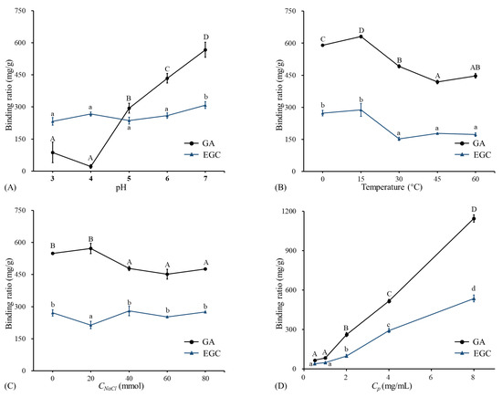 The binding ratios of GA and EGC to LRPs at different pH, temperatures, NaCl concentrations, and phenol concentrations. (A) The binding ratios of GA and EGC to LRPs at different pH, temperature of 15 °C, and mass ratio of GA/EGC to LRPs of 2:1; (B) the binding ratios of GA and EGC to LRPs at different temperatures, pH 7, and mass ratio of GA/EGC to LRPs of 2:1; (C) the binding ratios of GA and EGC to LRPs at different NaCl concentrations, pH 7, temperature of 15 °C, and mass ratio of GA/EGC to LRPs of 2:1; (D) the binding ratios of GA and EGC to LRPs at different C phenol concentrations (different mass ratios of GA/EGC to LRPs of 1:4, 1:2, 1:1, 2:1, 4:1), pH 7, and temperature of 15 °C. Means of the samples with different letters (A–D, a–d) differ significantly (p < 0.05).