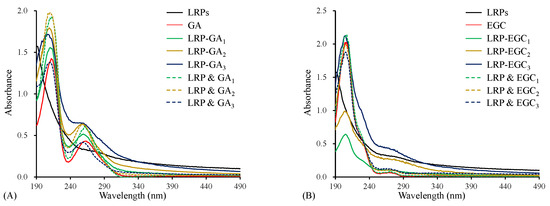 The UV–Vis spectra of LRPs, polyphenols, LRP-phenol complexes, and their physical mixtures. LRPs, GA, LRP-GA complexes, and their physical mixture (A); LRPs, EGC, LRP-EGC complexes, and their physical mixture (B).