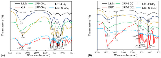 FTIR spectrum analysis was carried out to characterize the binding of GA and EGC on LRPs. Figure 4A shows the FTIR spectrum of LRPs, GA, their physical mixture, LRP-GA, LRP-GA, and LRP-GA complexes. The GA spectrum exhibited typical broad absorption bands of O-H stretching vibrations (3316 cm and 3288 cm), C=O stretching vibration (1709 cm), aromatic ring with substitutions (1620 cm, 1541 cm), C-C and C-O stretching vibrations (1446 cm, 1200–1300 cm, 1024 cm), and C-H bending vibration (867 cm) [21,30,31]. The LRP & GA physical mixture had a similar FTIR spectrum to GA, except for the absorption peak at 2925 cm. The broad peak at 2925 cm was attributed to the C-H stretching vibration of LRPs, which was also observed on the FTIR spectra of LRPs, LRP-GA, LRP-GA, and LRP-GA [11]. The O-H stretching vibration bands in LRP-GA complex spectrum (at 3397 cm, 3294 cm, and 3391 cm for LRP-GA, LRP-GA, and LRP-GA, respectively) were broader than that in the GA and LRP spectrum. It was reported that the O-H stretching band is a sensitive indicator of the strength of the hydrogen bond, and broadening of the O-H stretching band is often observed in strong hydrogen bonds [32]. Here, it was suggested that the hydrogen bond was formed between LRPs and GA. Compared to GA, the bands located at 1709 cm, 1541 cm, 1446 cm, 1244 cm, and 1203 cm disappeared for LRP-GA complexes; the absorption peaks at 1340 cm and 1308 cm were attenuated and shifted, leading to absorption peaks at 1398 cm and 1406 cm on the spectra of LRP-GA and LRP-GA, respectively. LRP-GA, LRP-GA, and LRP-GA spectra had characteristic peaks at 1041 cm, 1078 cm, and 1078 cm, respectively, which was likely related to the shift of the GA band at 1024 cm. The absorption intensity of bands at 897 cm decreased.