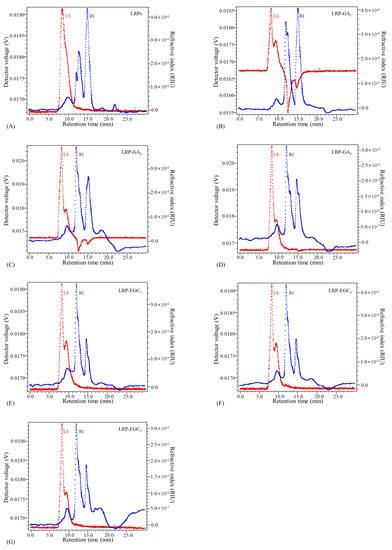 Elution profiles of LRPs and LRP-phenol complexes obtained by the HPSEC-MALL-RI method. LRPs(A);LRP-GA(B); LRP-GA(C); LRP-GA(D); LRP-EGC(E); LRP-EGC(F); LRP-EGC(G). Dotted line in blue presents the refractive index (RI) intensity, dotted line in red presents the light scattering (LS) intensity.