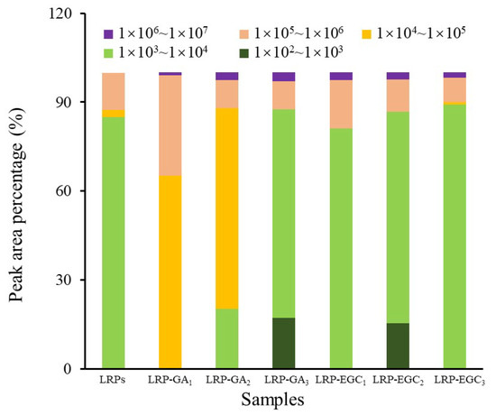 The elution profiles of LRPs and LRP-phenol complexes as a function of the elution time obtained by the HPSEC-MALL-RI method are presented in Figure 5, the retention time and peak area percentages of their fractions in different MW ranges are summarized in Table 2 and visually presented in Figure 6. The peak area percentage is proportional to the concentration of fractions, which can be used to calculate the weight-average MW. In general, the weight-average MWs of LRP-phenol complexes were significantly higher than those of LRPs. The peak area percentages of LRP fractions in the MW ranges of 1 × 10 × 10, 1 × 10 × 10, and 1 × 10 × 10 were 84.9%, 2.5%, and 12.5%, respectively. Compared to LRPs, fractions in a higher MW range of 1 × 10 × 10 were observed for LRP-GA complexes; fractions in the MW range of 1 × 10 × 10 increased and in 1 × 10 × 10 decreased for LRP-GA and LRP-GA complexes. Particularly, both had the lowest MW of 17.36 kDa and 6.79 kDa, respectively. This indicated that free GA was not found in LRP-GA/GA complexes (the MW of GA is 306 Da). These results imply that GA was successfully combined with LRPs. The fraction of LRP-GA in the lower MW range of 1 × 10 × 10 was observed, which could be due to the low binding ratio and aggregation of GA. LRP-EGC complexes also had fractions in the high MW range of 1 × 10 × 10. By contrasting to LRPs, fractions in the ranges 1 × 10 × 10 and 1 × 10 × 10 increased for LRP-EGC and LRP-EGC, respectively. Several studies [13,16] had similar results showing that polysaccharide-phenol complexes had different MW distributions with polysaccharides.