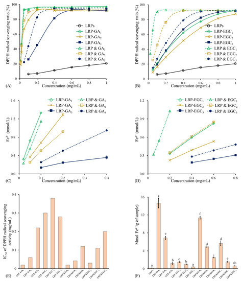 As shown in Figure 7A, the DPPH radical scavenging ratio of LRPs linearly increased with the increase in concentration and reached 20.6% at 1 mg/mL. The results are similar to those obtained by Su & Li. [38]. In general, LRP-GA/EGC complexes and their mixtures had significantly stronger DPPH radical scavenging activity than LRPs, which was due to the hydrogen-donating ability and redox property of GA/EGC (Figure 7A,B) [39]. Yong et al. [36] also reported that dialdehyde starch displayed enhanced antioxidant activity after grating with catechins. The IC values of LRP-GA, LRP-GA, LRP-GA, LRPs & GA, LRPs & GA, and LRPs & GA were 0.02, 0.06, 0.22, 0.02, 0.04, and 0.12 mg/mL, respectively (Figure 7E). The higher binding ratio/mass ratio of GA in samples contributes to better DPPH radical scavenging activity. Moreover, LRP-GA and LRP-GA complexes showed less free-scavenging activity than their corresponding mixtures; this may be explained by the fact that the hydrogen bonds combine between LRPs with GA and consumption of hydroxyl groups. Similarly, LRP-EGC complexes exhibited lower DPPH radical scavenging ratios as well as higher IC values compared to their mixtures. Notably, there was a difference in DPPH radical scavenging activities between LRP-GA and LRP-EGC complexes, which was due to the different type and total content of phenol.