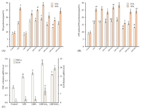 NO is an important immune-regulatory signaling molecule whose release from macrophages can suppress the growth of bacterial infection or cancer cells [41]. Further, excessive production of NO can induce oxidative stress and inflammatory disease [42]. The levels of NO and LRP-induced NO production from RAW 264.7 cells treated with different samples for 24 h and 48 h are shown in Figure 8A,B. LRPs and LRP-GA/EGC complexes were used at same LRP concentration of 200 g/mL. Cells treated with LPS at 500 ng/mL were applied as a positive group. Regarding cells incubated for 24 h, the level of NO produced from LRP-treated cells had no significant difference to that from the control; values were 8.58 and 8.01 mol/L, respectively. The LRP-GA/EGC complexes and LPS all stimulated NO production as compared to the control, showing increasing NO production in the order: LRP-EGC< LRP-EGC< LRP-EGC≤ LPS < LRP-GA≤ LRP-GA< LRP-GA at 13.05, 14.7, 15.59, 15.72, 17.0, 17.7, and 18.95 mol/L, respectively. Combination with GA/EGC significantly increased the stimulation of LRPs, whereas the increase in the GA/EGC compound in complexes had no positive effect on NO levels, suggesting that LRPs in complexes play the major role in the stimulation mechanism. A similar phenomenon was observed for the cells incubated after 48 h. For cells stimulated by LPS, LRP-EGC complex showed an inhibitory effect on the LPS-induced NO production. Particularly, LRP-EGC and LRP-EGC significantly decreased the LPS-induced NO production for cells incubated after 24 h, and LRP-EGC showed a significantly inhibitory effect on LPS-induced cells after 48 h.
