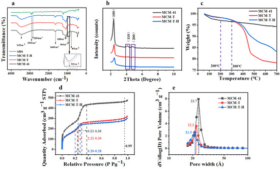 (a) FTIR spectra of MCM−41, MCM−T, MCM−T−H, and SDS; (b) XRD spectra of MCM−41, MCM−T, and MCM−T−H; (c) TGA patterns of MCM−41, MCM−T, and MCM−T−H; (d) nitrogen adsorption–desorption isotherms of MCM−41, MCM−T, and MCM−T−H; and (e) pore size distribution of MCM−41, MCM−T, and MCM−T−H.