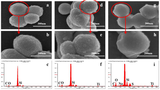In order to further study the surface morphology characteristics of the three materials, SEM and EDS characterizations were carried out (Figure 3). The particle size of MCM-41 was about 200–350 nm (Figure 3a,b) with a rough surface and hexahedral structure. After functionalization with TTIP, Ti was attached to the surface of MCM-41 (Figure 3f), forming a coarser surface morphology (Figure 3d,e). Figure 3g–i shows that SDS, which contained S and Na, successfully grafted onto the material surface and made the surface of the morphology smoother. Functionalization did not obviously change the morphology of the hexahedron. This was consistent with the results of TEM (Figure S2), and Figure S2b,d shows that uniform pores were distributed in the material.