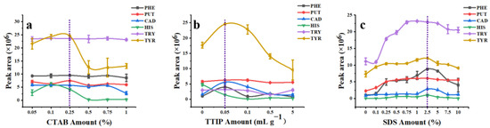 MCM-41 is a kind of amorphous mesoporous silica material with a unique hexahedral structure [41]. Mesopore size can be adjusted by altering the amount of CTAB. Overall, the addition amount of CTAB had little effect on the extraction efficiency of MCM-41 for all target analytes except TYR (Figure 4a) (TTIP and SDS amounts were 0% in these experiments). When the additional amount of CTAB was 0.25%, MCM-41 had the best adsorption performance for PHE, PUT, TRY, and TYR. Under this condition, MCM-41 with a higher specific surface, larger pore volume, and appropriate mesoporous pore size (Table S1, surface area: 893.33 m2 g–1; pore diameter: 2.37 nm; total pore volume: 0.73 cm3 g–1) showed the highest extraction capacity to derivatized BAs. Therefore, 0.25% of CTAB was selected as the optimal additive amount to synthesize MCM-41.