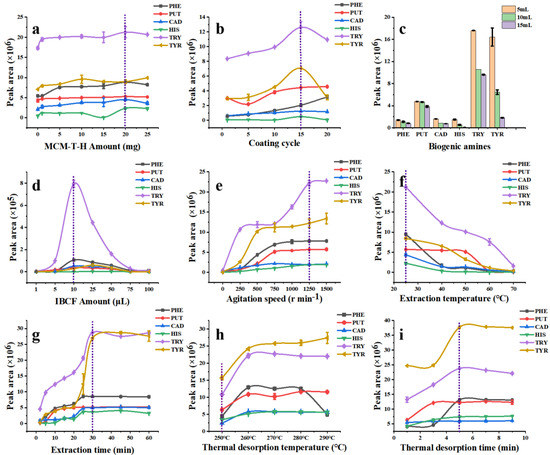 Optimization of SPME Arrow procedures, (a) MCM−T−H amount; (b) coating cycle; (c) sample volume; (d) derivatization reagent amount; (e) agitation speed; (f) extraction temperature; (g) extraction time; (h) thermal desorption temperature; (i) thermal desorption time.