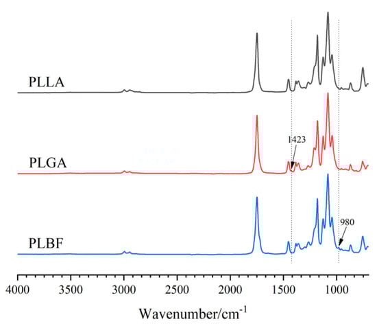 ATR-FTIR spectra of PLLA, PLGA, and PLBF.