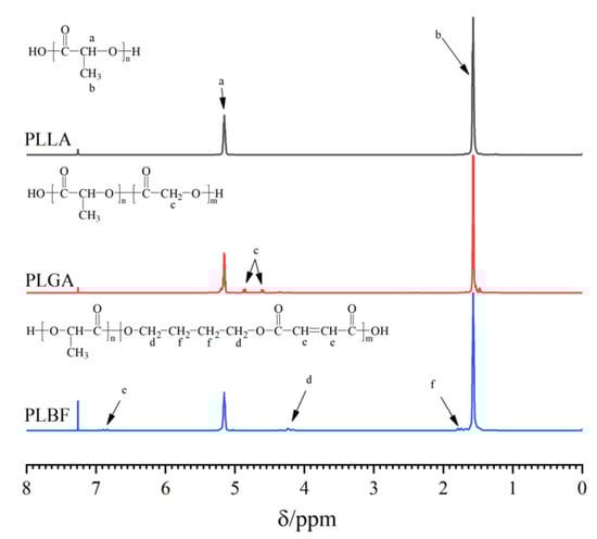 1H NMR spectra of PLLA, PLGA, and PLBF.
