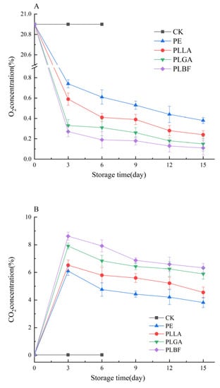 Figure 3A shows the variation pattern of O2 inside each package group with storage time. The O2 concentration of all four package treatments, PE, PLLA, PLGA, and PLBF, showed a sharp decrease in O2 concentration during 3 days of storage. The oxygen concentration fluctuated between 0.74%–0.38%, 0.59–0.24%, 0.74–0.38%, 0.33–0.15%, and 0.27–0.11%, respectively. Typically, lower oxygen concentrations slow the respiration rate of mushrooms, reducing changes in physiological structure and extending shelf life. In contrast, the respiration of mushrooms was first inhibited in the PLBF package group due to its lowest OP. Due to the relatively close O2 concentrations in each sample package, the effects on the weight loss of mushrooms may not differ greatly after reaching equilibrium. A similar study noted that the O2 concentration in the package was less than 1% on the 15th day but still better maintained the quality of edible mushrooms better and prolonged storage to 25 days [].