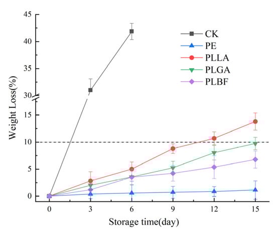 The quality loss of mushrooms packaged in PE film was always at a low level, only 1.7% after 15 days of storage, which was significantly lower than that of the PLLA (13.8%), PLGA (9.75%), and PLBF groups (6.78%), which was mainly due to the low water vapor permeability of the PE film, which resulted in a high humidity environment inside the package and reduced transpiration [,]. However, after 3 days of storage of Agaricus bisporus, water droplets could be found on both the film and Agaricus bisporus in the PE group packaging, and with the extension of the storage period, a large number of water droplets condensed to produce condensation, and condensation inside the packaging would promote the growth of microorganisms and accelerate the spoilage of Agaricus bisporus.
