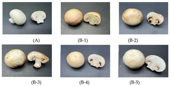 The color of mushrooms during storage was measured using a portable colorimeter (CR-20, Minolta Co., Ltd., OSAKA, Japan). Three mushrooms were randomly selected from each packaged group after calibration using the accompanying standard white plate. As a result of testing the center of the mushroom cap, L (lightness), a (redness), and b (yellowness) values were gathered. The resulting browning index (BI) can be calculated as follows [].