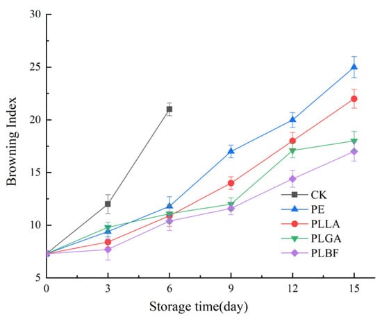 Agaricus bisporus is prone to browning after harvest, and the degree of browning increases as the time after harvest increases (Figure 5). It is generally believed that the browning of fresh Agaricus bisporus is mainly caused by enzymatic browning, and during storage, white mushrooms turn from white to brown or black due to enzymatic browning of the substrates, which negatively affects their commercial value []. Figure 6 illustrates the impact of packaging on BI when mushrooms are packaged in different films. All mushrooms showed an increase in BI during storage, indicating that their whiteness was reduced. Figure 6 shows that the BI of both the CK group and the packaged group increased as the storage period increased. On day 3 of storage, there was a significant difference in BI between the CK group and the packaged group, with the control group having a significantly higher BI than the packaged group. After day 9 of storage, the BI of the PLBF group was significantly lower than that of the PE, PLLA, and PLGA groups, and this advantage was maintained until the end of the storage period. The high BI value in the PE group is probably a result of high relative humidity in the package, which resulted in high bacterial growth, reproduction, and number, and therefore Agaricus bisporus substrates were degraded and the oxidation of phenolic substances by tyrosinase produced brown substances [].