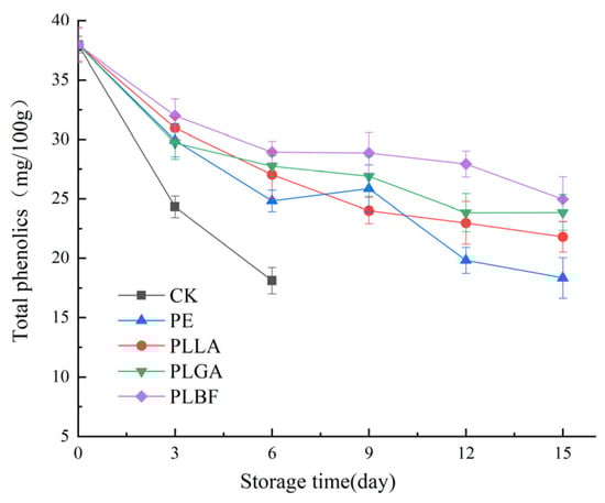 Phenolic compounds are major antioxidant components in mushrooms and other plants. They are important secondary metabolites that scavenge free radicals and chelate metals and reduce lipoxygenase activity, which is essential in resisting adverse external environmental stresses, internal oxidative stresses, and pathogenic bacterial growth infestation. Oxidation of phenolics is the main factor in the postharvest browning of Agaricus bisporus, which adversely affects its commercial value [,]. As shown in Figure 7, mushrooms’ total phenolic (TP) content was reduced differently in different packages. The TP content in the control group was the lowest at the end because polyphenols might convert to quinones by polyphenol oxidases and react with oxygen to form brown-colored compounds [].