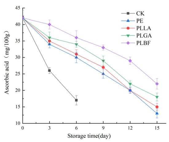 Changes of total ascorbic acid of Agaricus bisporus in each packaging group during storage.
