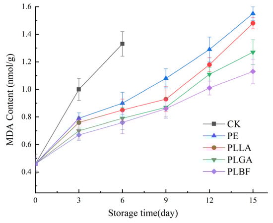 Electrolyte leakage(EC) and malondialdehyde (MDA) content indicate the extent of damage and membrane lipid peroxidation in Agaricus bisporus cell membranes [,], which is indicative of the quality of Agaricus bisporus as is evident from Figure 9 and Figure 10, which show that the electrolyte leakage and MDA of all samples raised gradually during storage. The explanation for this is that the quality of Agaricus bisporus continues to decline with storage time, with soft wilting and browning, leading to oxidation of the lipids and efflux of cytoplasm from Agaricus bisporus.