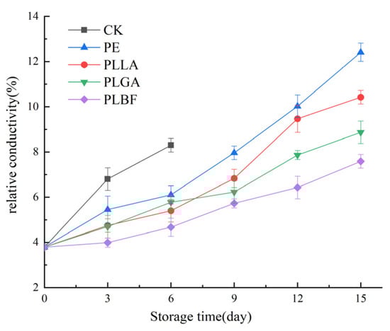 Changes of relative conductivity of cell membrane of Agaricus bisporus in each group during storage.