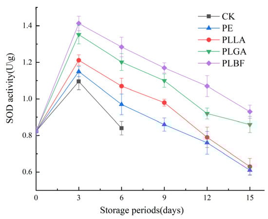 Changes of SOD activity of Agaricus bisporus in each packing group during storage.