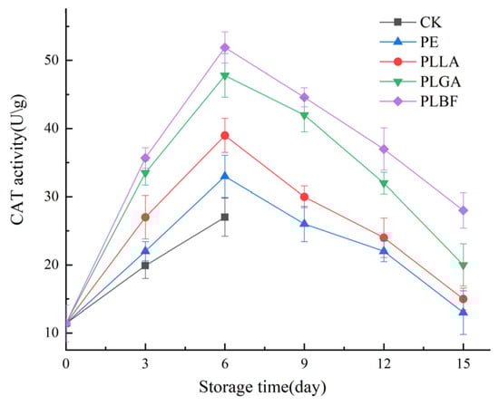 Changes of CAT activity of Agaricus bisporus in each packing group during storage.