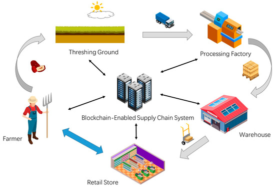 We investigated the local jujube supply chain in Alar (Xinjiang, China), and found that the whole supply chain is composed of five main phases, namely, plantation, threshing ground, processing factory, warehouse, and retail store. Jujube ripens in four to six months. Local farmers pick the ripe fruits and put them in the local threshing ground for drying. Relevant processors purchase jujubes in batches from production cooperatives with unified purchase prices. Due to the opacity of information exchange and the long-term trade inertia, farmers have almost no bargaining power in this case. Jujubes are packaged into boxes and stored in the warehouse after being processed. Finally, jujubes are transported to retail stores in boxes for sale. Based on our investigation, the application scenario of our jujube SCM framework is shown in Figure 1.