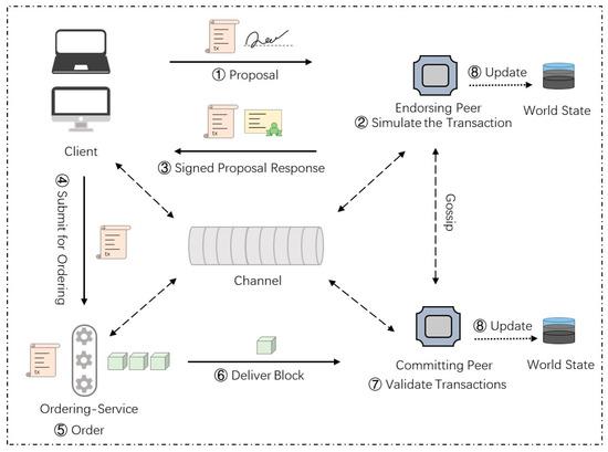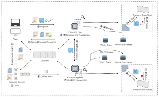 The following are more details of the key steps in a common transaction workflow. The main components in the workflow are listed in Table 2. In Hyperledger Fabric, all nodes participating in the network must obtain corresponding certificates and public and private key pairs from the certificate authority. Here, we assume that all nodes have obtained the relevant encryption materials.