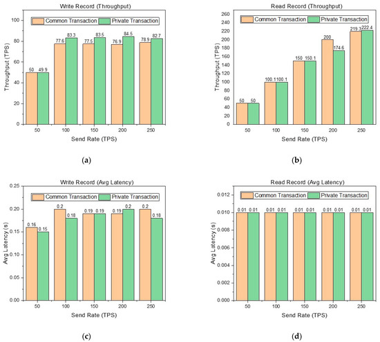 In Figure 6, it is obvious that reading records are better than writing records in the performance metrics of throughput and average latency. This is because writing records involves the process of endorsement and consensus, while reading records only requires reading the world state database of the node. In Figure 6a, although the send rate can reach 250 TPS, the throughput limit of writing records in the common transaction is about 78 TPS, and the throughput limit of writing records in the private transaction is about 83 TPS. The throughput of writing records in the private transaction is higher than that in the common transaction. Writing records in the common transaction involves the endorsement and consensus of three organizations, while writing records in the private transaction only involve the endorsement and consensus of two organizations, which is the main reason why the latter is better than the former. This proves that our design in Section 2 is reasonable. That is, logistics, processing, and warehousing are abstracted into one organization rather than three organizations respectively. This reduces the number of organizations participating in endorsement and consensus. Figure 6b shows that the throughput limit of reading records in the common transaction and private transaction is about 220 TPS. When the send rate is 200 TPS, the throughput performance of reading records in the private transaction is significantly lower than that in the common transaction. Thrashing causes this result. In Figure 6c,d, we can see that the average latency of reading and writing records is excellent in different situations.