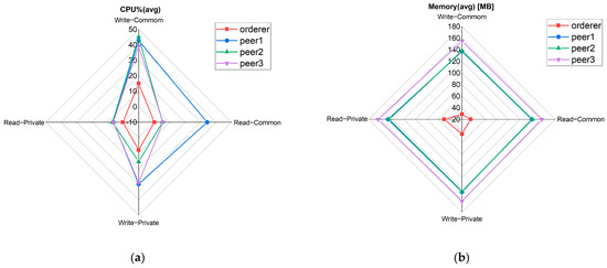 In Figure 7a, peer1 is the node with the highest CPU utilization. When writing records in the common transaction, its CPU utilization is the highest, about 43%. In Figure 7b, the average memory utilization of the three peer nodes is basically the same, ranging from 140 MB to 160 MB. The average memory utilization of the orderer node is low, with a maximum of 60 MB.
