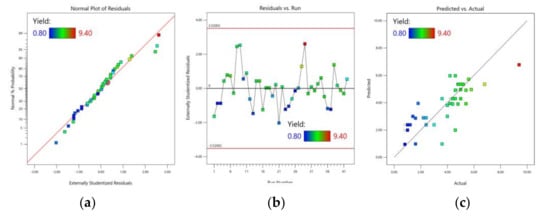 Analysis of the model of the responses for the yield of pectin extraction. (a) Normality plot of the residuals for the yield model shown in Equation (7); (b) Student’s t external distribution of the residuals; and (c) correspondence between the actual values of the yield responses and the values obtained with the model shown in Equation (7).