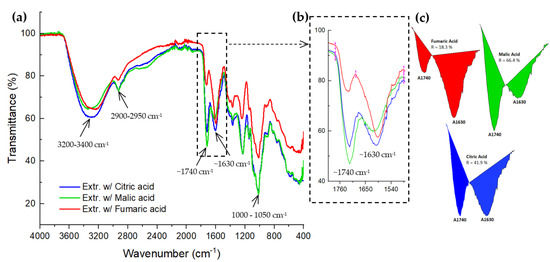 FTIR spectra of the pectin obtained from d-CPH and (a) extracted with the different organic acids employed in this study. (b) The peaks and their areas are analysed in the zones close to ~1740 and ~1630 cm−1, which correspond to the esterified and free carboxyl groups, respectively. (c) Areas at ~1740 cm−1 and ~1630 cm−1 for each FTIR spectrum and the calculation of the R-value (Equation (7)).