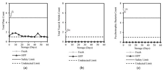 Changes in (a) Total Plate Count, (b) Total Yeast and Molds Count, and (c) Psychrotrophic Bacteria Count of HPP and ESL milk during 60-day storage (log10 CFU/mL).