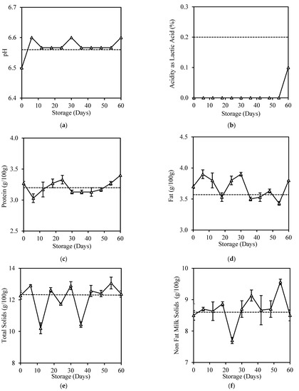 Changes in (a) pH, (b) Acidity as Lactic Acid, (c) Protein, (d) Fat, (e) Total Solid, and (f) Non-Fat Milk Solids of HPP milk during 60-day storage. Dotted lines represent the fresh milk before treatment.