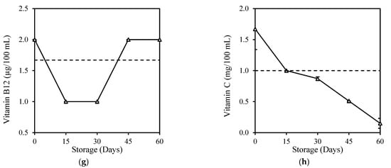 Changes in (a) Vitamin A, (b) Vitamin B3, (c) Vitamin B5, (d) Vitamin B6, (e) Vitamin B7, (f) Vitamin B9, (g) Vitamin B12, and (h) Vitamin C of HPP and ESL milk during 60-day storage. Dotted lines represent the fresh milk before treatment.