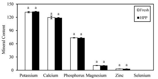 Changes in mineral content of fresh milk after HPP treatment. Potassium, Calcium, Phosphorus, and Magnesium in unit mg/100 mL; Zinc and Selenium in unit mg/kg. Alphabet “a” represent no significant difference between bar at p > 0.05.