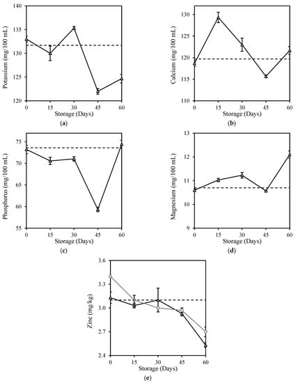 Changes in (a) Potassium, (b) Calcium, (c) Phosphorus, (d) Magnesium, and (e) Zinc contents of HPP and ESL milk during 60-day storage. Dotted lines represent the fresh milk before treatment.