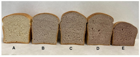 Experimental bread loaves. (A) control sample, (B) 1% Cornelian cherry powder addition, (C) 2% Cornelian cherry powder addition, (D) 5% Cornelian cherry powder addition, and (E) 10% Cornelian cherry powder addition.