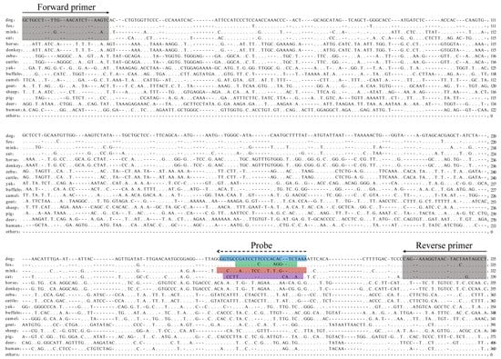 The nuclear DNA sequences of dogs were aligned with the genome sequences of pigs, cattle, sheep, horses, rabbits, mice, chickens, and ducks downloaded from GenBank using the local BLAST+ tool (NCBI BLAST+ 2.12.0+). The sequences with the alignment parameters of ‘Query-length’ >200 bp, ‘Identity’ <80%, and ‘E-value’ <10−5 were selected and aligned with the genome sequences of cat, fox, and mink, and the sequences with ‘Query-length’ >200 bp and ‘Identity’ >80% were identified as the candidate target sequences. Subsequently, these sequences were aligned with the reference genome sequences of 40 other species, including representative species of four kingdoms, 10 classes, 19 orders, 28 families, and 37 genera (ostrich, goose, duck, turkey, chicken, human, hedgehog, elephant, pig, deer, horse, donkey, camel, sheep, goat, zebu, buffalo, cattle, yak, pika, rabbit, squirrel, rat, mouse, guinea pig, beaver, hamster, jerboa, fruit fly, salmon, zebrafish, frog, anole, wheat, rice, maize, soybean, Salmonella, Escherichia coli, and yeast), using online nucleotide BLAST (https://blast.ncbi.nlm.nih.gov/Blast.cgi. accessed on 10 September 2020). Homologous sequences were retrieved and aligned using ClustalW multiple sequence alignment (https://www.genome.jp/tools-bin/clustalw. accessed on 15 September 2020) to determine the conserved and hypervariable regions. Sequences with relatively low homology with non-target species, high conservation at the two ends, and sufficient base differences in the middle of the target sequence were selected as nuclear DNA target sequences.