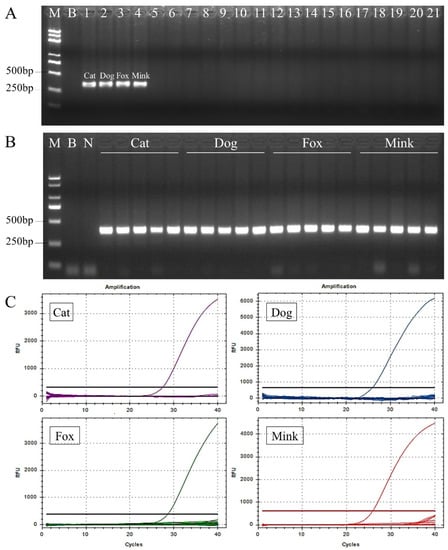 Evaluation of specificity and conservation of the nuclear DNA target sequences, primers, and probes for cat, dog, fox, and mink DNA. (A) Evaluation of specificity of the nuclear DNA target sequences and primers using conventional PCR. DNA templates of the conventional PCR are Lane B, blank (water); Lane N, negative control; Lane 1, cat; Lane 2, dog; Lane 3, fox; Lane 4, mink; Lane 5, domestic horse; Lane 6, donkey; Lane 7, yak; Lane 8, cattle; Lane 9, buffalo; Lane 10, sheep; Lane 11, goat; Lane 12, pig; Lane 13, deer; Lane 14, rabbit; Lane 15, mouse; Lane 16, rat; Lane 17, hamster; Lane 18, guinea pig; Lane 19, chicken; Lane 20, duck; Lane 21, goose. (B) Evaluation of conservation of the nuclear DNA target sequences and primers in five individual samples from each species. (C) Evaluation of specificity of each probe for cats, dogs, foxes, and minks using TaqMan real-time PCR.