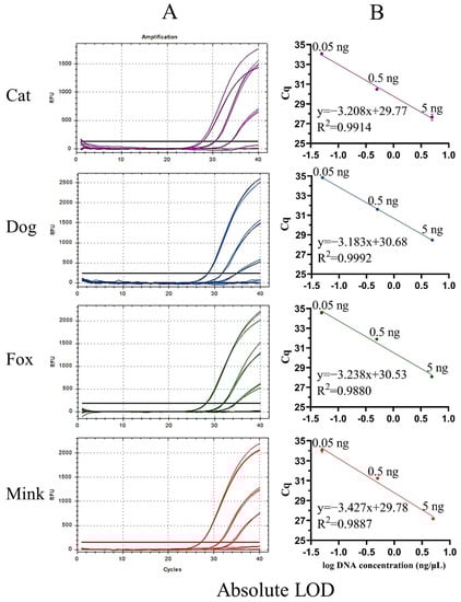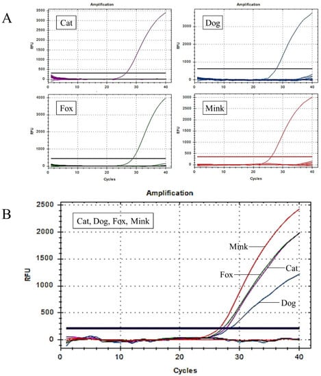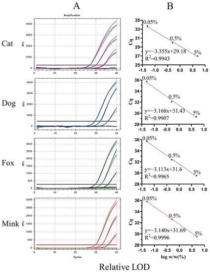 In a multiplex real-time PCR system, the ratio of the probes affects the specificity and sensitivity of the reaction [39]. The proportion of each probe was optimised to ensure significant fluorescence signals and the lowest Cq values for the simultaneous detection of cat, dog, fox, and mink components by real-time PCR. Optimal results were obtained when the probe ratios of cats, dogs, foxes, and minks were 6:3:8:2. Considering that the interaction between universal primers and probes can decrease detection accuracy, it is necessary to test the specificity of the UP-M-rtPCR system. Cross-specificity was tested by UP-M-rtPCR in 21 species, including four target species (cat, dog, fox, and mink) and 17 non-target species (domestic horse, donkey, yak, cattle, buffalo, goat, sheep, pig, deer, rabbit, mouse, rat, hamster, guinea pig, chicken, duck, and goose). As shown in Figure 3A, a significant fluorescence signal was generated only when the target DNA was detected. This clearly demonstrates that no cross-reaction with any non-target animal-derived ingredients was detected until the PCR cycles exceeded 36, and a Cq value of 36 was used as the cut-off point. Furthermore, the four independent fluorescence amplification curves in the UP-M-rtPCR assay showed that it could be used to detect cats, dogs, foxes, and minks simultaneously in one reaction (Figure 3B). In conclusion, the UP-M-rtPCR system showed good specificity for 21 species. The four target species were identified and differentiated in a single reaction. Since many meat products may be unintentionally or incidentally mixed with several target species, multiplex PCR for simultaneous detection can save considerable time and labour costs [40]. However, the sensitivity and accuracy of conventional multiplex PCR methods are inevitably reduced owing to the potential cross-reactivity between multiple primer pairs [41]. In this study, a multiplex real-time PCR approach using only one pair of universal primers, named UP-M-rtPCR, was developed, which can simplify the reaction system and fundamentally eliminate or reduce the probability of potential primer–primer/primer–probe dimers. The UP-M-rtPCR approach can specifically identify and distinguish cats, dogs, foxes, and minks in a reaction in approximately one hour, thereby improving the detection efficiency and accuracy along with saving time and reducing the cost of the reaction.